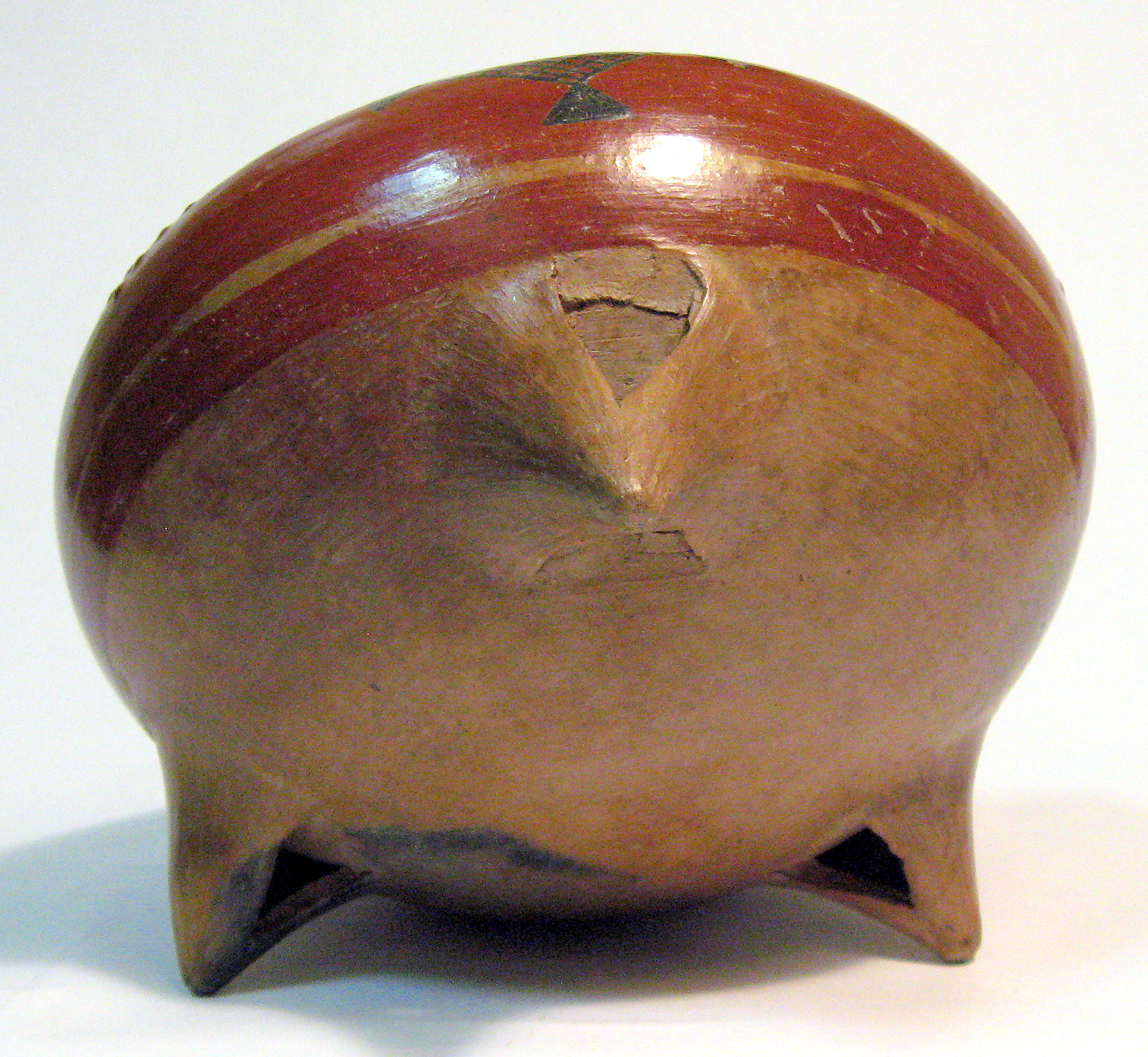 Globular bodied bowl with compressed neck and slightly flared rim. Triangular pointed legs, with triangular cut-outs removed inside and out. Buff inside. Outside has red around the body from the midheight up, with a very thin line left unpainted all round. On the upper third are painted linear black diamond designs alternated with similar designs formed by 15 small raised bumps, over-painted.